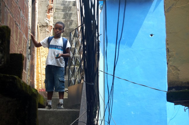 Blue shorts, blue backpack, blue music player. This little boy came running home from school just as I was struck by the vibrant colours of his Rio de Janeiro home.